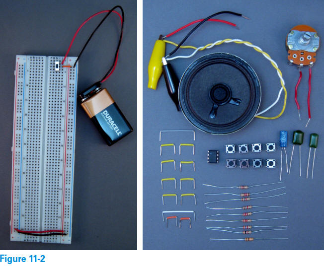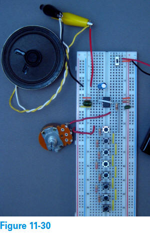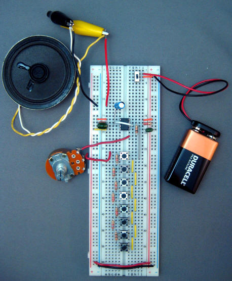 Si vous faites abstraction du montage en échelle de résistances et d'interrupteurs, de la résistance de 10 kΩ et du potentiomètre, vous constaterez que la structure de ce circuit est identique à celle du circuit d'effets sonores commandés par la lumière du Projet 10.