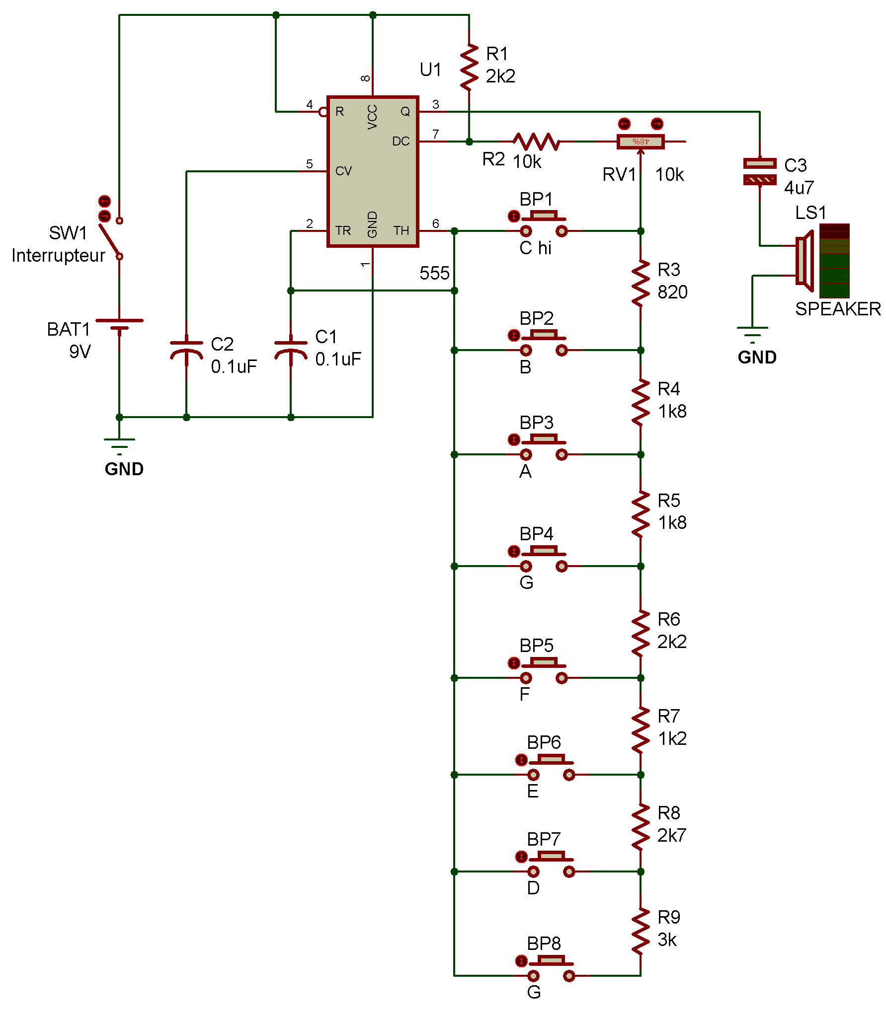 Chaque interrupteur connecte un ensemble différent de résistances entre les broches 7 et 2.