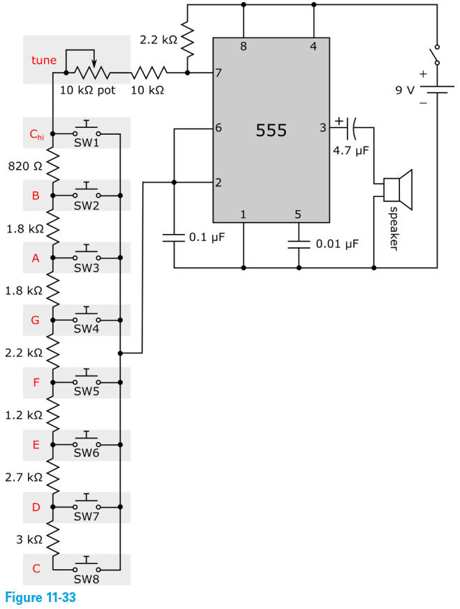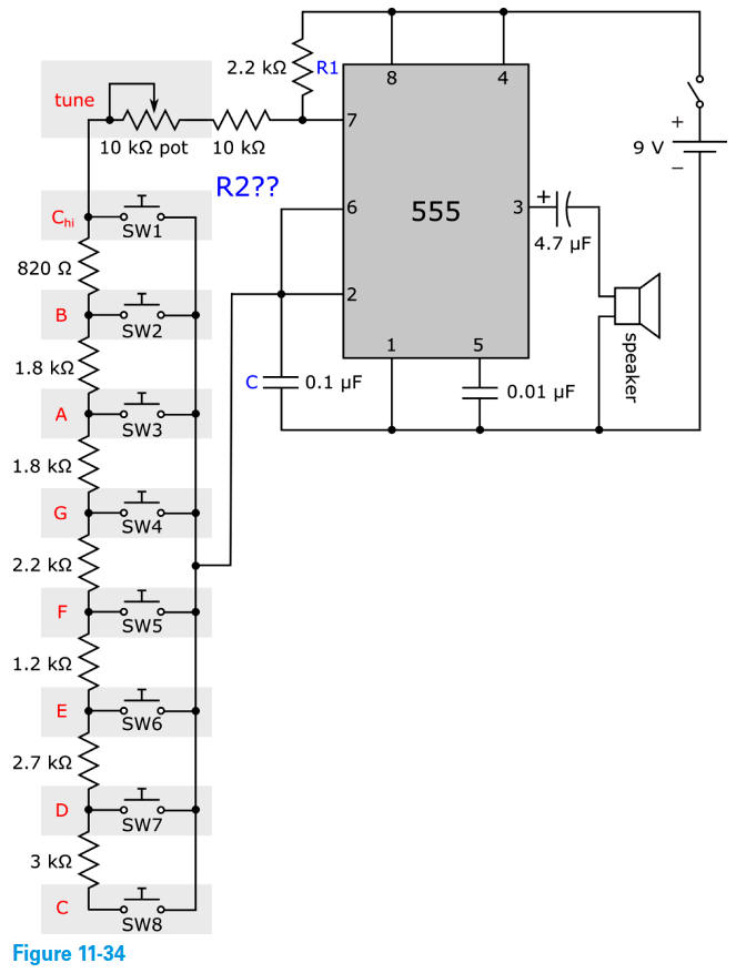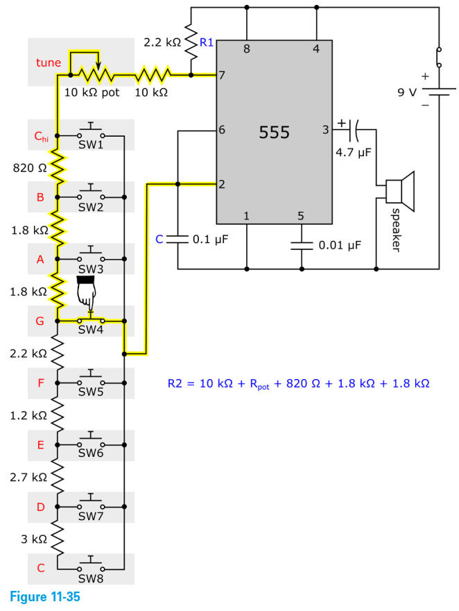 En substituant cette résistance totale (qui dépend de la résistance exacte du potentiomètre), ainsi que les valeurs de R1 et C, dans l'équation de la fréquence, on obtient la fréquence du son produit lorsqu'on appuie sur SW4.
