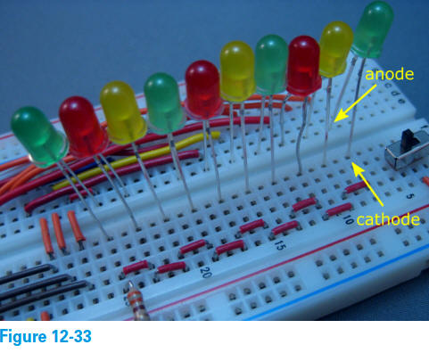 Les cathodes des LED sont reliées entre elles et à l'une des bornes de la résistance de 330 Ω.