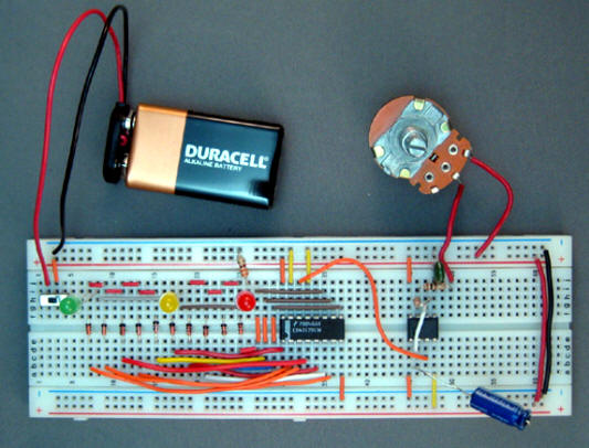 Le potentiomètre de 100 kΩ, la résistance de 100 Ω, la résistance de 22 kΩ et le condensateur de 47 μF situés à gauche de la minuterie 555 contrôlent la temporisation de la tension de sortie sur la broche 3.