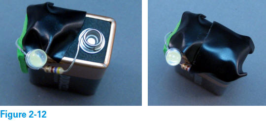 7. Collez le fil le plus long (anode) de la LED sur le côté de la batterie. (Voir Figure 2-13.)