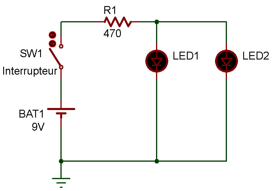 Chaque branche contient une LED. Le courant circule dans les deux branches, allumant les deux LED.