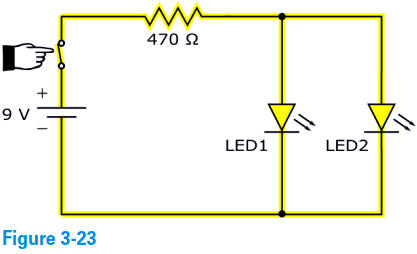 Le schéma du circuit parallèle à deux LED, illustré à la figure 3-23, montre un chemin divisé, comme une bifurcation, d'un côté de la résistance.