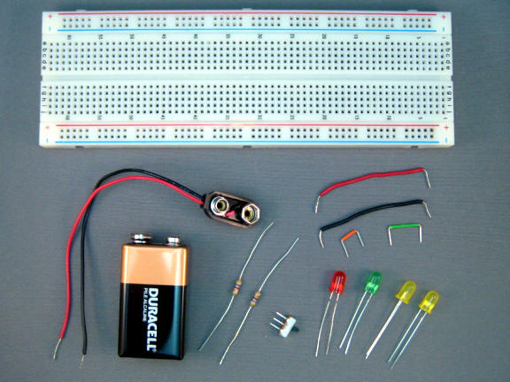 Les principaux composants des circuits de test de votre plaque d'essai sans soudure sont une pile, deux résistances et quatre LED.