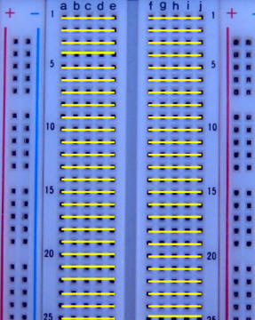 La figure 3-4 présente une partie de ma platine d'expérimentation, avec des lignes jaunes ajoutées pour indiquer l'emplacement des connexions dans les sections centrales (ignorez les colonnes extérieures pour l'instant).