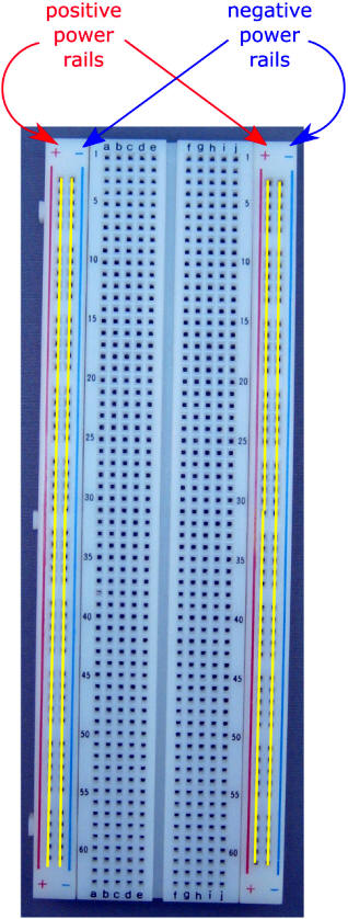 La plupart des platines d'expérimentation possèdent deux paires de colonnes étiquetées + et − sur les bords extérieurs.