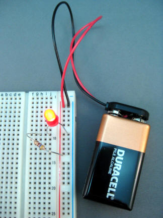 Mais dans le circuit inférieur, le courant circule de la borne positive de la batterie, à travers la résistance de 470 Ω (rangée 30), à travers le fil de liaison vert, à travers la LED jaune et jusqu'à la borne négative de la batterie ; la LED s'allume donc.