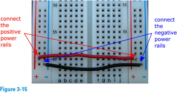 Connectons donc les deux rails d'alimentation positifs et les deux rails d'alimentation négatifs à l'aide des fils de liaison de 5 cm que vous avez mis de côté au début de ce projet.
