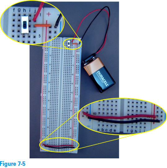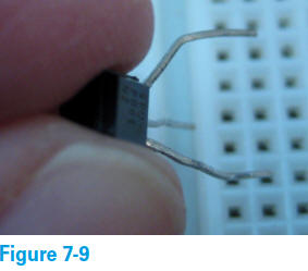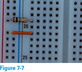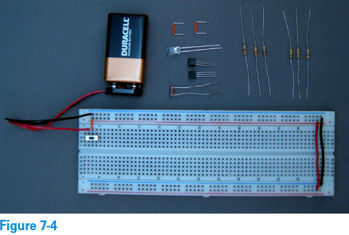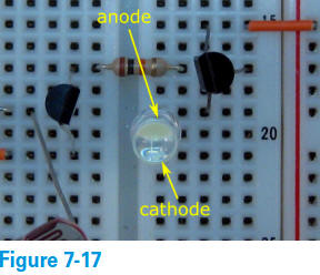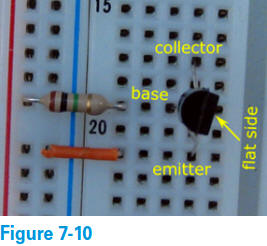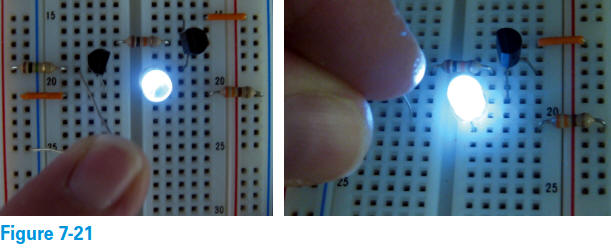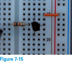 La troisième étape (entourée sur la figure 7-25) du circuit comprend un deuxième transistor, une résistance de limitation de courant de 10 kΩ à la base du transistor, une LED et une résistance de protection de 330 Ω pour la LED.