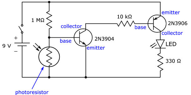 Cependant, le courant de base reste très faible en raison des résistances élevées du premier étage du circuit (à savoir la résistance de 1 MΩ et la résistance supérieure à 1 MΩ de la photorésistance dans l'obscurité).