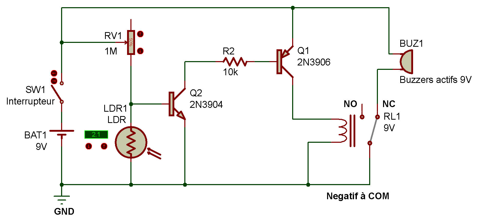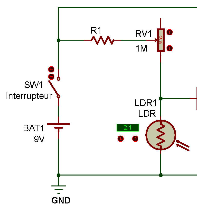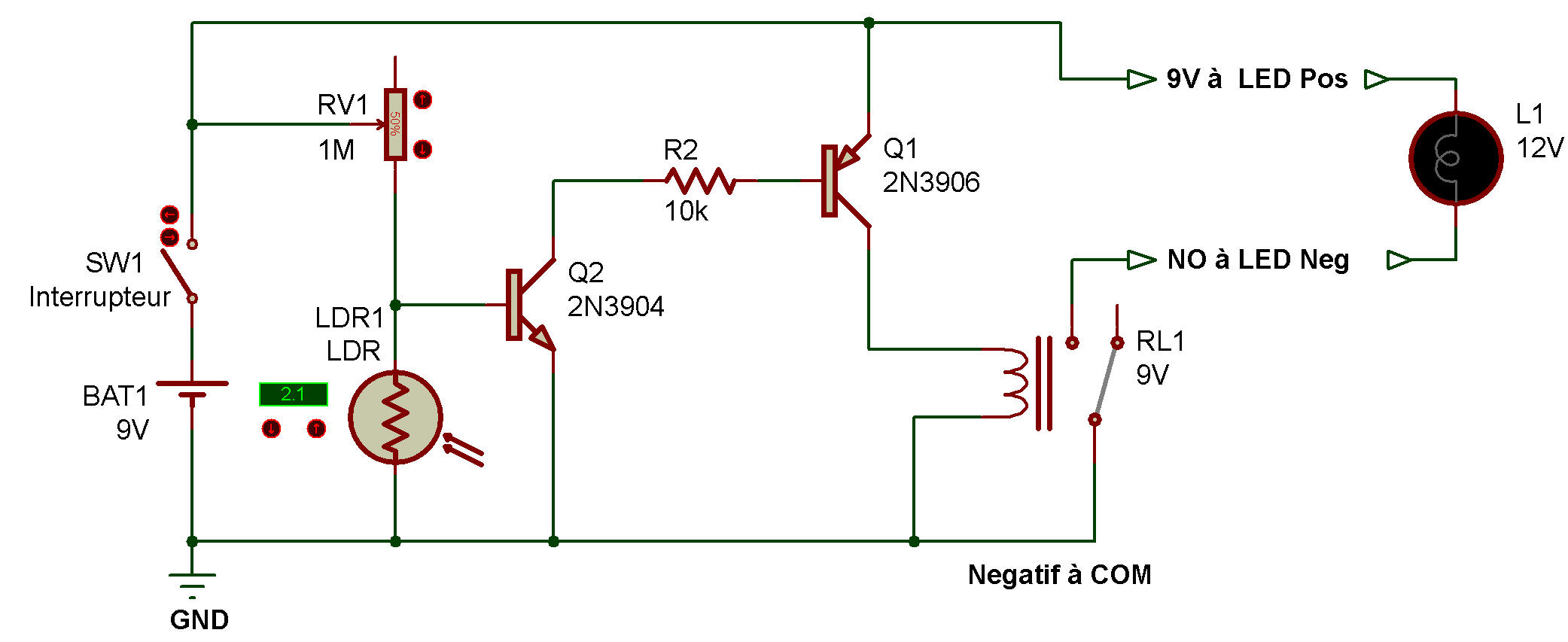 Ainsi, lorsque la pièce est bien éclairée, la tension aux bornes de la photorésistance (et donc la tension de base) est faible, et le transistor est bloqué.