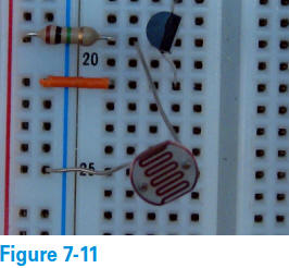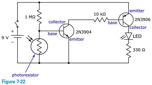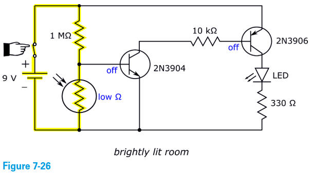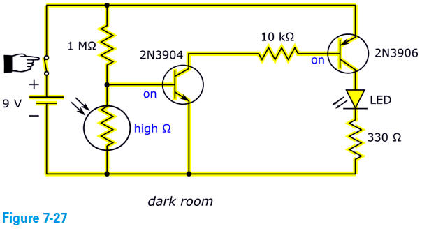 La figure 7-27 montre que, dans l'obscurité, la résistance de la photorésistance est élevée, ce qui augmente la tension à la base du premier transistor et l'active.