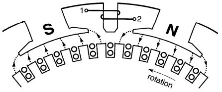 Or, nous savons (principe II de l'électromagnétisme) que le passage du courant dans les conducteurs de l'induit, situés dans le champ magnétique de l'aimant permanent, engendre une force sur chacun d'eux. L' action de ces forces produit un couple qui fait tourner l'induit.