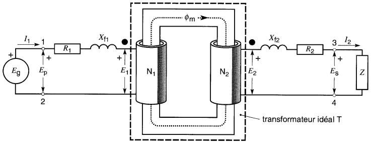 Le flux Φ créé par le primaire peut être subdivisé en deux parties: un flux mutuel Φm1 qui accroche les spires du secondaire, et un flux de fuite Φf1, qui ne les accroche pas.
